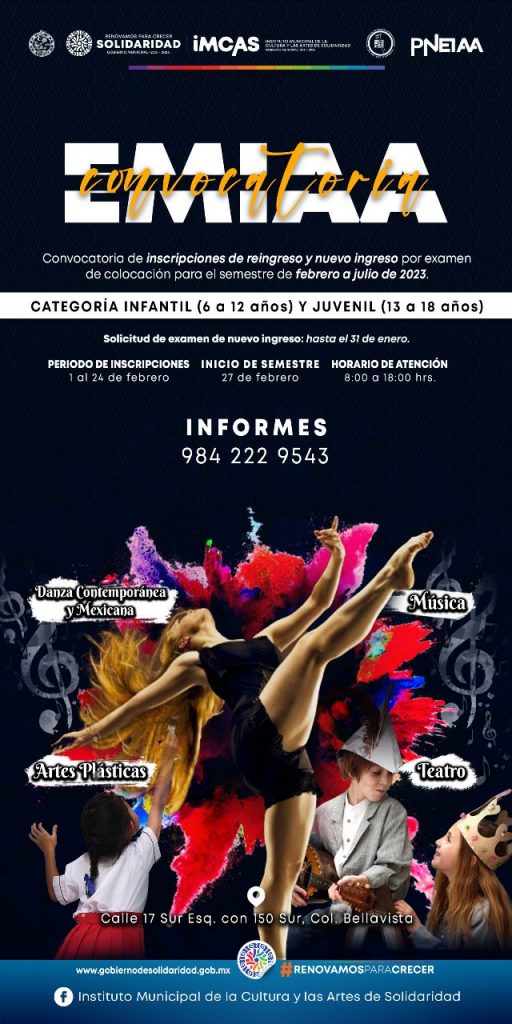 Como parte de las acciones del gobierno municipal de Lili Campos para impulsar la cultura y las artes en Solidaridad, esta semana se abrió la convocatoria de inscripciones para el reingreso y nuevo ingreso por examen de colocación para la Escuela Municipal de iniciación artística asociada al INBAL en el ciclo Escolar 2022-2023; correspondiente al semestre par, de febrero a julio de 2023.