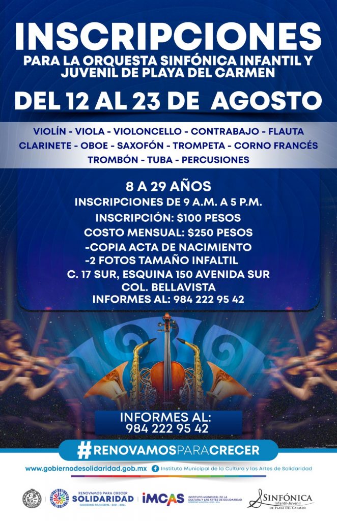 El gobierno de Solidaridad, a través del Instituto Municipal de la Cultura y las Artes de Solidaridad, se complace en invitar a menores de 8 años en adelante, así como a jóvenes y adultos de hasta 29 años, a inscribirse en la escuela de iniciación musical, pudiendo formar parte de la Sinfónica Infantil – Juvenil de Playa del Carmen.