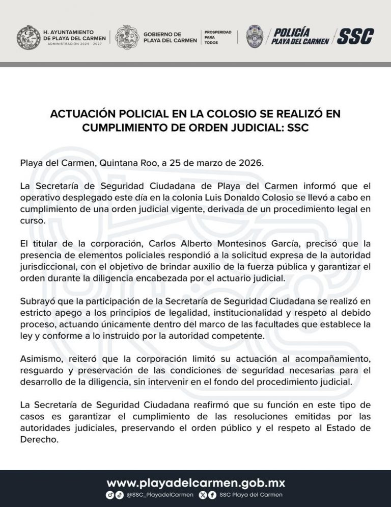 Playa del Carmen, Quintana Roo.— La Secretaría de Seguridad Ciudadana de Playa del Carmen informó que el operativo desplegado este día en la colonia Luis Donaldo Colosio se llevó a cabo en cumplimiento de una orden judicial vigente, derivada de un procedimiento legal en curso.