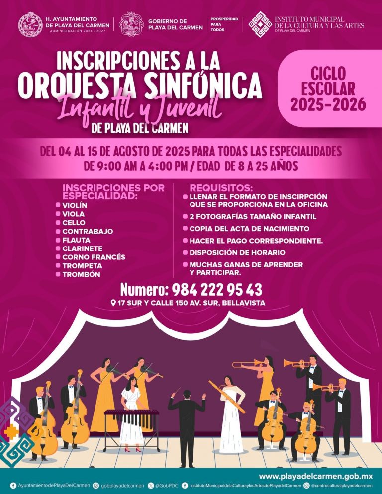 Playa del Carmen, Quintana Roo.- El Instituto Municipal de la Cultura y las Artes de Playa del Carmen informó la apertura del periodo de inscripciones para 48 talleres en la Escuela de Iniciación Artística asociada al INBAL y lugares para la Orquesta Sinfónica Infantil y Juvenil.