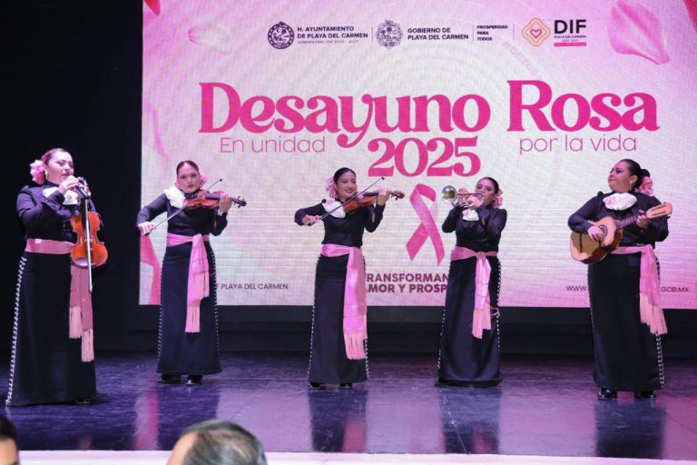 Playa del Carmen, Quintana Roo.– En un emotivo encuentro lleno de esperanza, unión y amor por la vida, el Gobierno de Playa del Carmen, encabezado por la alcaldesa Estefanía Mercado, llevó a cabo, a través del Sistema DIF Municipal, el Desayuno Rosa “En Unidad por la Vida”, un evento con causa que reunió a más de 300 personas para recaudar fondos destinados a estudios de mastografía y fortalecer la detección temprana del cáncer de mama.