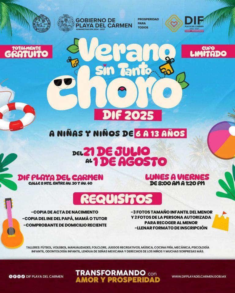 Playa del Carmen, Quintana Roo. – Con el objetivo de ofrecer a niñas y niños un espacio seguro, divertido y formativo durante las vacaciones, el Gobierno Municipal de Playa del Carmen, encabezado por Estefanía Mercado, a través del Sistema DIF Municipal presidido honoríficamente por Eduardo Asencio, invita al curso de verano “Verano sin tanto choro”, un programa gratuito dirigido a menores de entre 6 y 13 años.