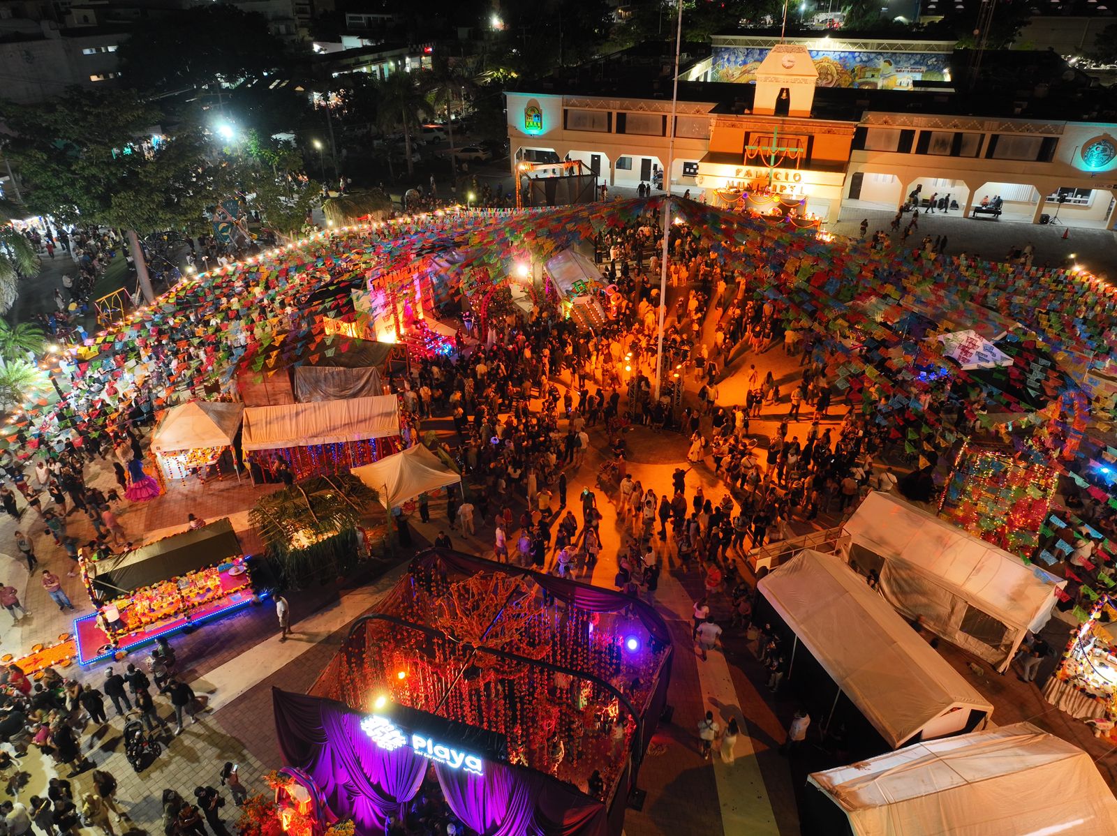 Playa del Carmen, Quintana Roo, 31 de octubre de 2025.- Con una multitudinaria asistencia de playenses y turistas dio inicio esta noche, en la Plaza 28 de Julio, el Janal Pixan 2025 “Pixano ob sáasilo ‘ob. Finados seres de luz”, que contó con una brillante exhibición de “Los Altares de México” y la presentación de artistas en el anfiteatro.