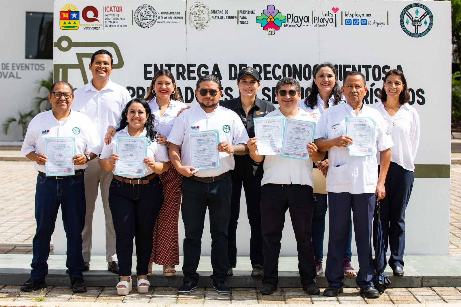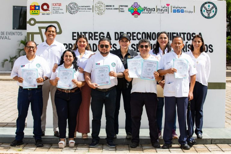 Playa del Carmen, Quintana Roo.– Con el firme objetivo de fortalecer la calidad en la atención a visitantes y habitantes del municipio, la presidenta municipal Estefanía Mercado encabezó la ceremonia de entrega de constancias de capacitación a prestadores de servicios turísticos y operadores del Sindicato de Taxistas “Lázaro Cárdenas del Río”, como parte del convenio de colaboración entre el Instituto de Capacitación para el Trabajo del Estado de Quintana Roo (ICATQR) y el Ayuntamiento.