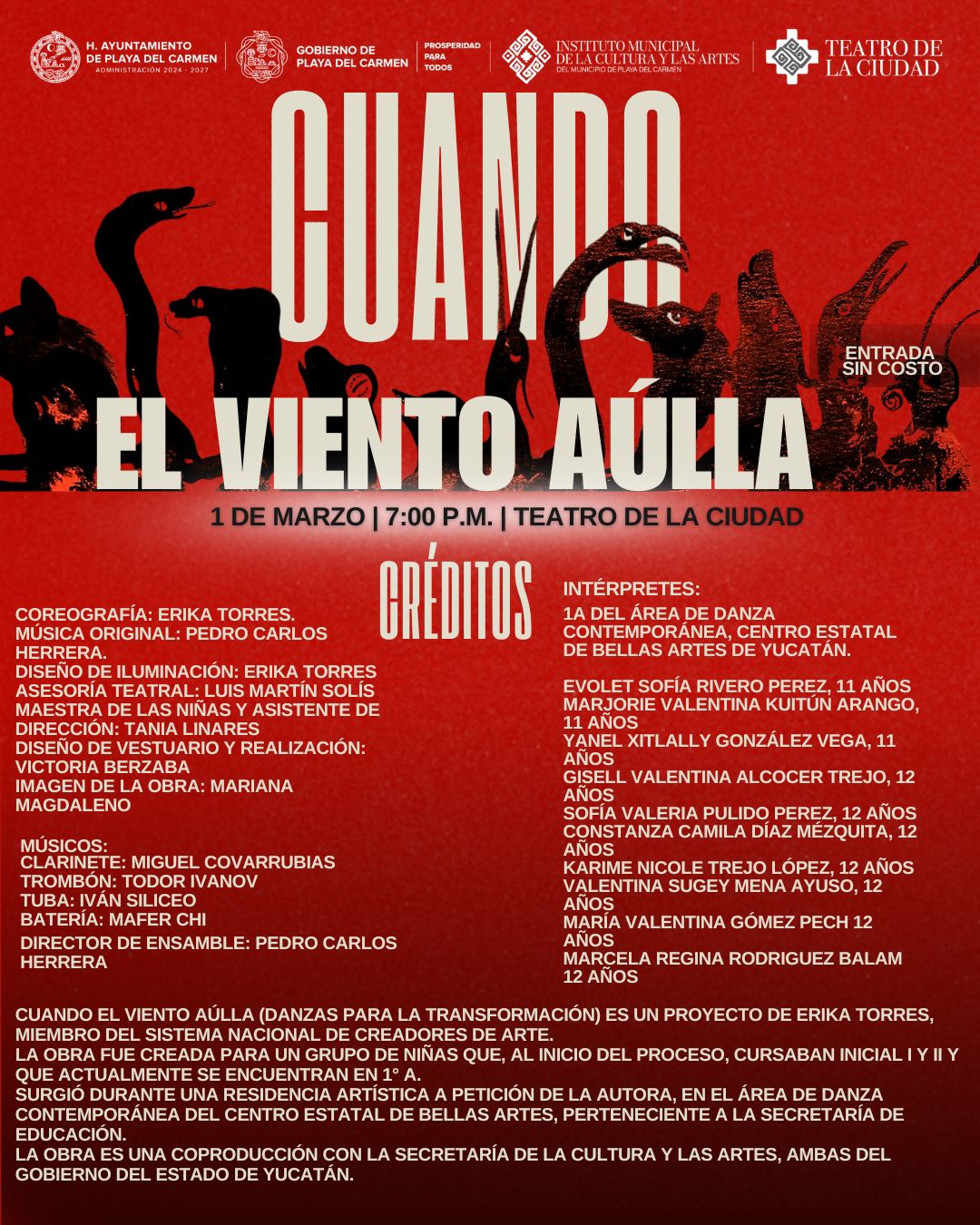 El Teatro de la Ciudad recibirá, el domingo 1 de marzo a las 19:00 hrs, a Erika Torres (Homenaje a Lorca y de Falla en enero 2025), ahora con la obra “Cuando el viento aúlla. Danza para la transformación”, en la que participan 10 niñas de entre 10 y 14 años.