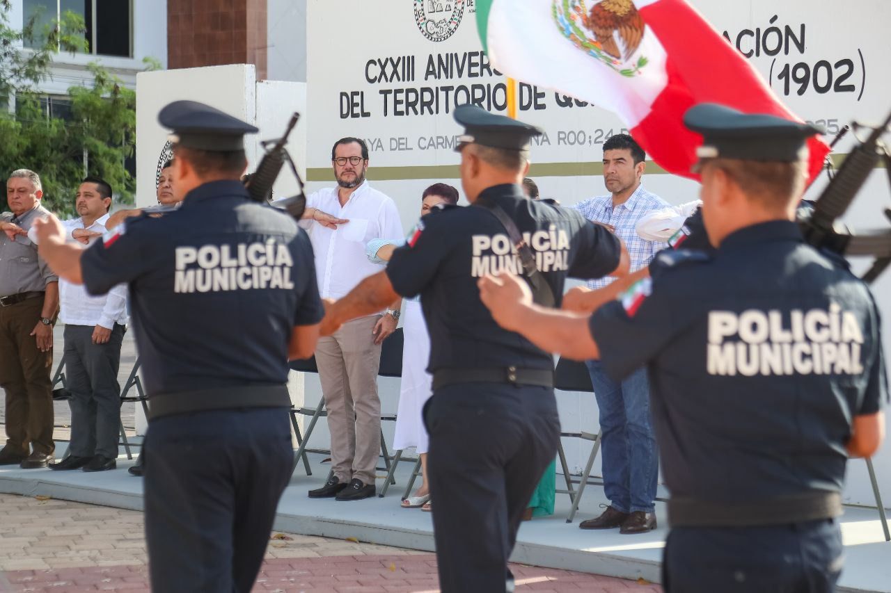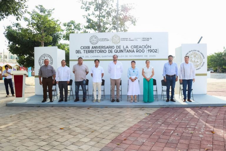 Playa del Carmen, Quintana Roo.– El Gobierno de Playa del Carmen, que encabeza la presidenta municipal Estefanía Mercado, conmemoró hoy el 123 aniversario de la creación del Territorio Federal de Quintana Roo, con una ceremonia cívica para rendir homenaje a este acontecimiento histórico y fortalecer la identidad como quintanarroenses.