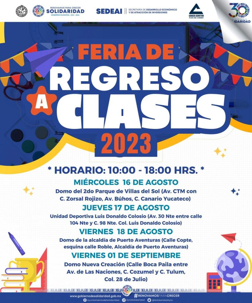 Para apoyar la economía de las familias solidarenses ante el regreso a clases, el gobierno municipal que dirige Lili Campos, a través de la Secretaría de Desarrollo Económico y de Atracción de Inversiones, invita a la Feria de Regreso a Clases 2023, del 16 al 18 de agosto y primero de septiembre.