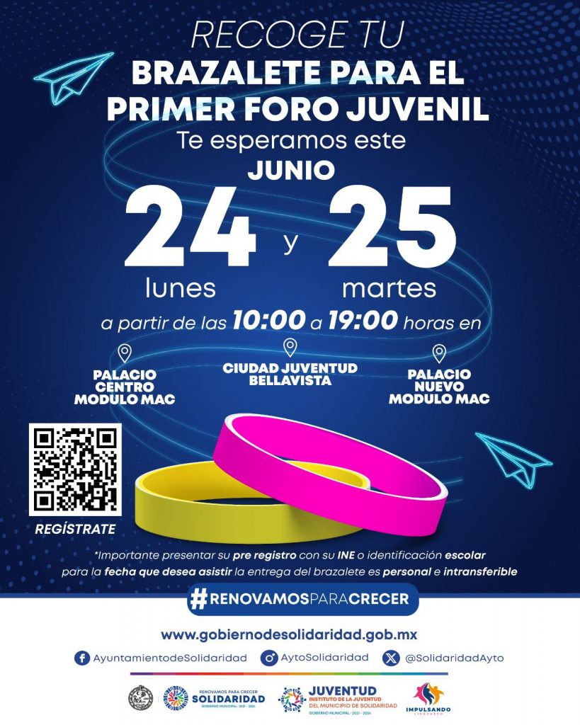 Es importante mencionar que los brazaletes para el foro se están entregando hoy lunes 24 y se continuará mañana martes de 25 de junio en horarios de 10 am a 7 pm en los siguientes lugares: Palacio nuevo, Palacio del Centro y en Ciudad Juventud. Para más información sobre el evento y para inscripciones, visite el sitio web https://bit.ly/forojuvenilPC o en las redes sociales injuve_solidaridad e Impulsando_liderazgo.