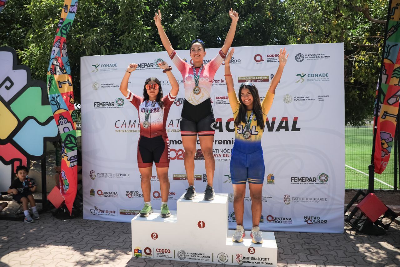 En una destacada participación colectiva, las quintanarroenses María Fernanda Morales Mujica, Sharby Alexia White y Alexandra López Cruz dominaron la prueba de 500 metros Juvenil Mayor femenil, ocupando el primero, segundo y tercer lugar, respectivamente.